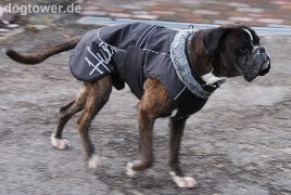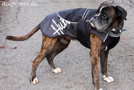 Boxer Neo hat von Herrchen den Hurtta Hundemantel Pro in schwarz geschenkt bekommen.