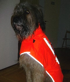 Frauchen freut sich sehr. Nicht nur dass der Overall vor Schmutz und Schnee wunderbar schützt, nein dem nicht genug, dieser steht meinem Sir wie ein Anzug und wenn er dann noch sein Krawatterl (Gurt) darüber angezogen bekommt... dann muss Er vorm Frauchen flüchten, sonst wird Er bestiegen und niedergeknuddelt,