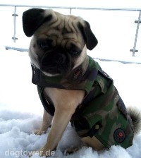 habe heute morgen (ganz unerwartet) schon mein Umtauschpaket entgegen nehmen dürfen. Vielen lieben Dank für die schnelle Bearbeitung!! Nicht lange gezögert durfte Milow seine neue Camouflagejacke in khaki/grün auch gleich anprobieren und siehe da: SIE PASST GENAU :)))) Gut verpackt drängelte mein Möpschen natürlich gleich raus in die Kälte um im Schnee zu toben. Anbei auch ein kleiner Schnappschuss von ihrem zufriedenen Kunden. Und kalt wirds uns draußen so schnell wohl nicht mehr :) !!