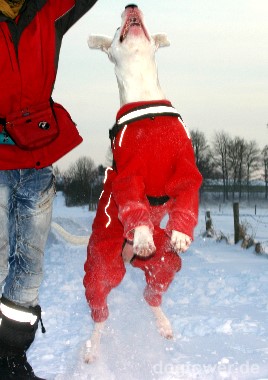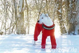 Liebes Team von dogtower.de, anbei ein paar Schneefotos von unser Dogo Argentino Hündin Kira mit dem Hurtta Pro Overall in rot. Vielen Dank nocheinmal für den tollen Service! Andreas & Ines P., Wassenberg