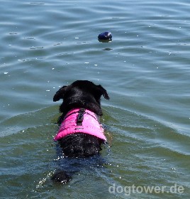 Beim Schwimmen sorgt nun Aysha für den Vorwärtstrieb und die Hurtta Schwimmweste übernimmt den Auftrieb.