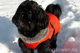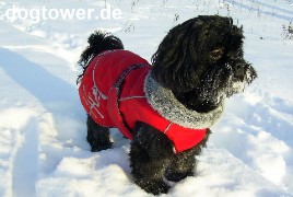 nach einigen Versuchen ist es mir doch noch gelungen, ein paar vorzeigbare Bilder von meinem 5-jährigen Lhasa-Apso Rüden Khyi-ra in seiner neuen Winterjacke (Hurtta Winterjacke Pro, rot Gr. 33) zu machen. Nachdem er sich die ersten paar Minuten in der neuen Jacke gar nicht bewegen wollte, ist er nun auf den Geschmack gekommen und so flink geworden, dass man ihn kaum noch vor die Linse bekommt. Besonders positiv finde ich, dass die Jacke nicht nur warm hält, sondern auch wasserdicht und reflektierend ist.