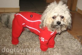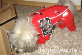 Habe heute den Anzug (Fleeceoverall Hurtta Pro, rot) erhalten und möchte ihn vorstellen Viele Grüsse Frau Ilse W. und Henry, Gotha