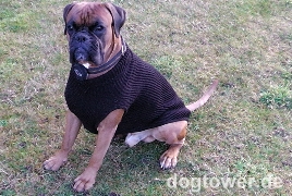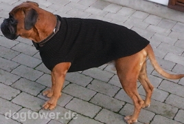 Guten Tag Frau Adolf, nun endlich die Bilder von Bruno. Mit freundlichen Grüßen Marina S., Berlin [ Boxerrüde Bruno hat von Frauchen Marina einen IQO Hundepullover in schwarz geschenkt bekommen. ]