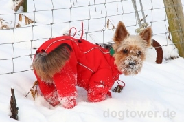 Unser kleines Yorkie Mädchen (1 Jahr) war immer am frieren, seitdem sie den Overall hat mag sie bei den Minustemperaturen gar nicht mehr nach Hause.