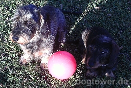 Hallo, anbei ein paar Bilder von unseren zwei Rauhaardackeln Xaferl (der Grosse) und Franzl (der kleine ) mit dem neuen Hundeball (Push-n Play aus Hartplastik, Jolly Pets) von Ihnen. Mit freundlichen Grüssen vom Chiemsee Rita M.