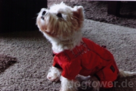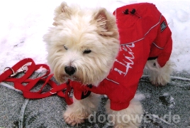 Anbei ein paar Fotos von mir, mit und ohne Regenanzug (Hurtta Outdooroverall Pro, rot). Der Anzug gefällt mir sehr gut, die Beine hätten etwas länger sein können. Die Wasserdichtigkeit konnte ich noch nicht prüfen. Laufen sitzen, und liegen geht mit dem Anzug prima. Mein Frauchen hat also die richtige Wahl getroffen.