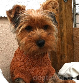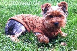 [ Dieser kleine Yorki hat von Frauchen Helga den IQO Hundepullover P20 in cognac geschenkt bekommen. ]