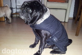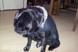 hier ein paar Fotos von Dandy mit seinem neuen Hundemantel (Wolters Parka mit Fellkragen).