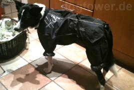 Der Regenmantel (Hurtta Outdoor- Hundeoverall) passt in der neuen Größe erstaunlich gut.