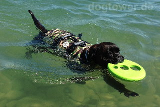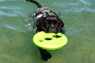 [ Boxerhündin Joop hat von Ihrem Frauchen die Ezydog Hundeschimmweste Seadog L in camouflage geschenkt bekommen. Vielen Dank für die gelungenen Bilder vom 1sten Einsatz inkl. der Rogz Hundefrisbee RFO. ]