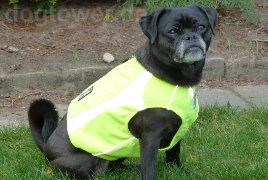 gerne sende ich Ihnen Fotos unserer Dolores von Germanika. Sie ist eine 3,5 jährige Rassmo-Hündin (ca. 1/3 Jack-Russel und 2/3 Mops) und fühlt sich sehr wohl mit der Weste (Hurtta Polarweste Lifeguard in neongelb). In der Taille ist noch etwas Platz, aber die breite Mops-Brust brauchte die Größe M.